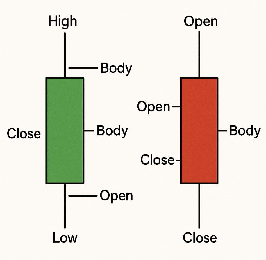 - 각 캔들은 해당 기간의 시가(Open), 종가(Close), 고가(High), 저가(Low)를 나타낸다.